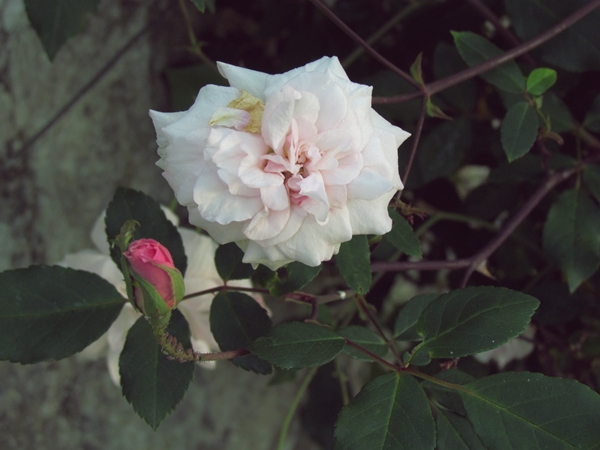 Quando voltei para dentro reparei nesta foto. Na altura em que a tirei a minha ideia era simplesmente captar o contraste de cores. Só depois reparei num outro contraste. Pensei em como um pequeno botão à medida que vai desabrochando, vai perdendo a cor. À medida que cresce torna-se maior e mais imponente mas também mais branco, mais pálido. E na rosa da fotografia até uma pétala amarela, gasta pelo tempo contrastava com o tom claro da flor. Botão e flor, as duas lado a lado.